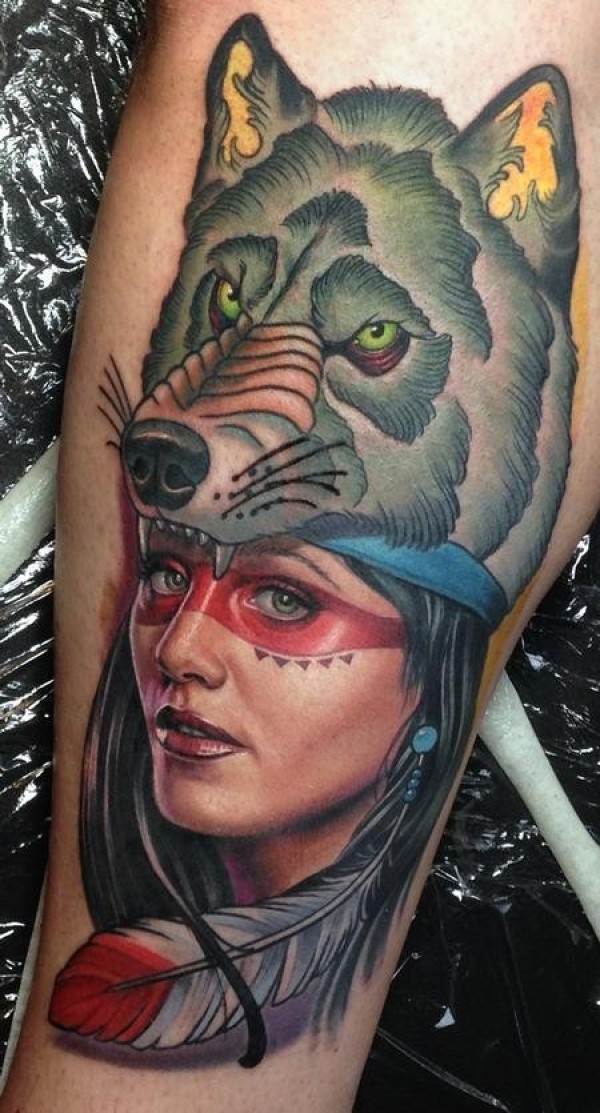 腿部非常漂亮的印度女人肖像与狼头盔纹身图案