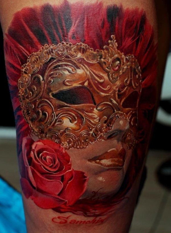 华丽漂亮的彩色女人面具玫瑰字母纹身图案