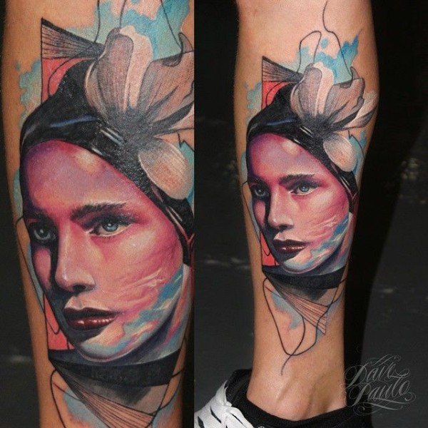 小腿彩色的女人肖像与花朵纹身图案