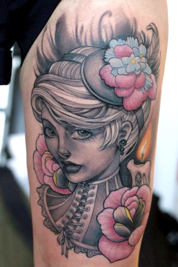 大腿彩色女人肖像与蜡烛和花朵纹身图案