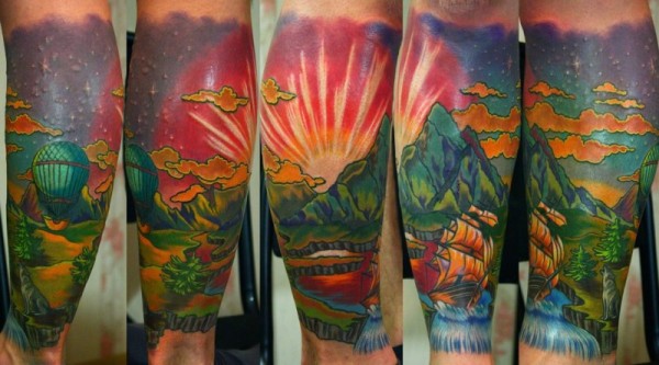 小腿好看的彩色美丽乡村景色纹身图案