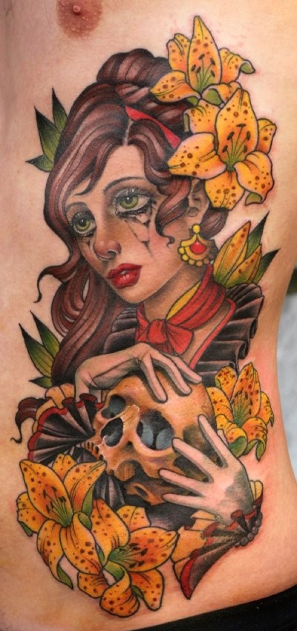 侧肋现代风格彩色美丽女人与骷髅纹身图案