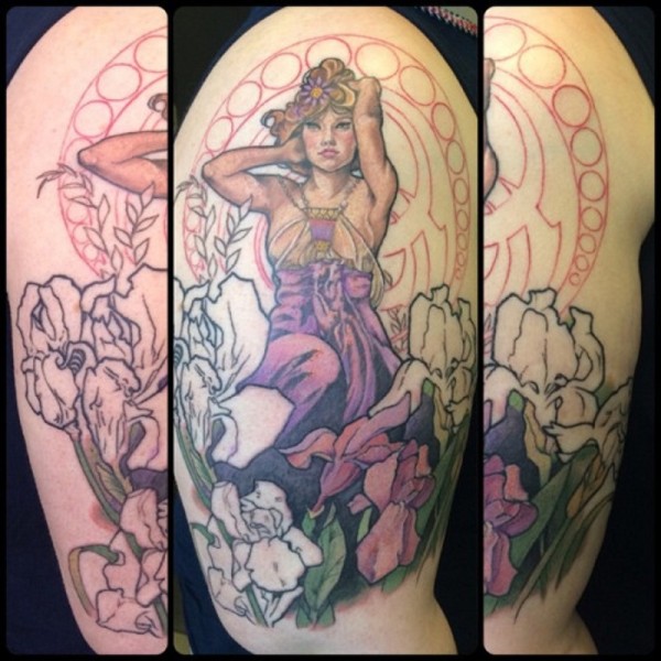 大臂old school美女和野花纹身图案