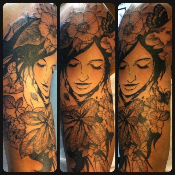 old school大臂黑白女性肖像与各种花卉纹身图案