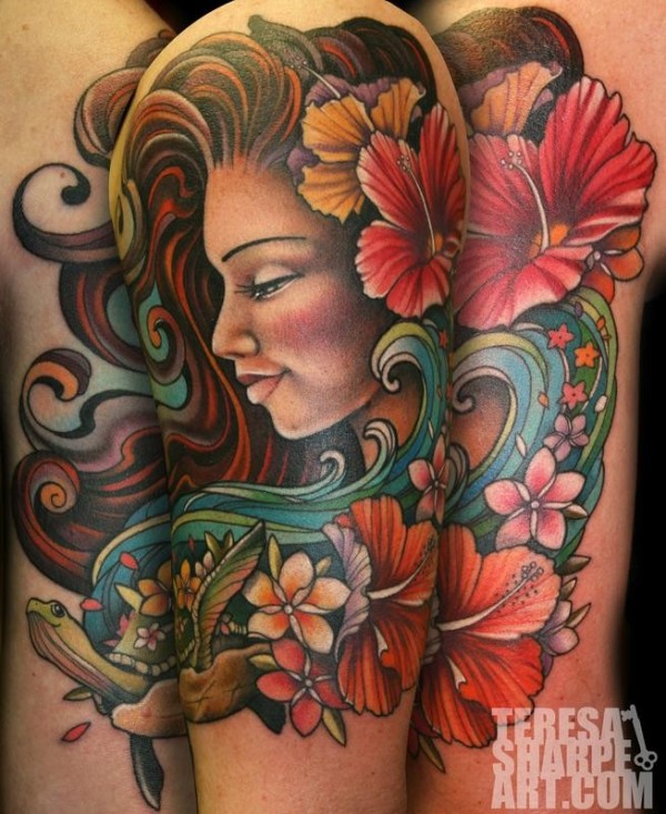 大臂old school彩色美女肖像花朵蛇纹身图案