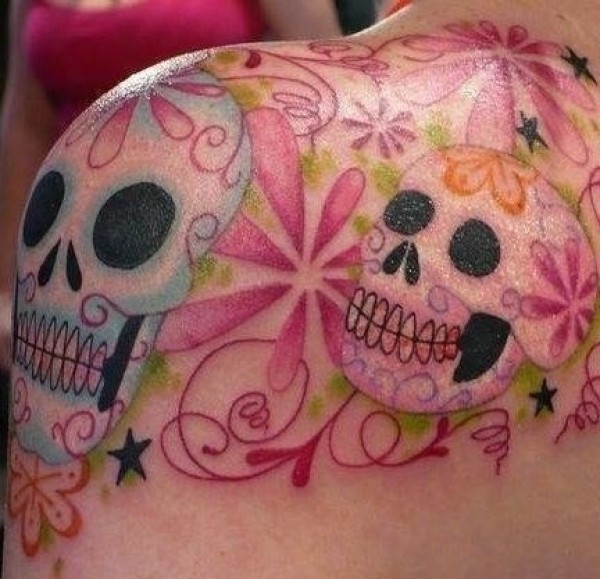 肩部彩色墨西哥传统骷髅与花朵星星纹身图案