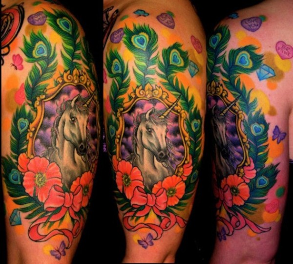 大臂美丽的彩色独角兽孔雀羽毛纹身图案