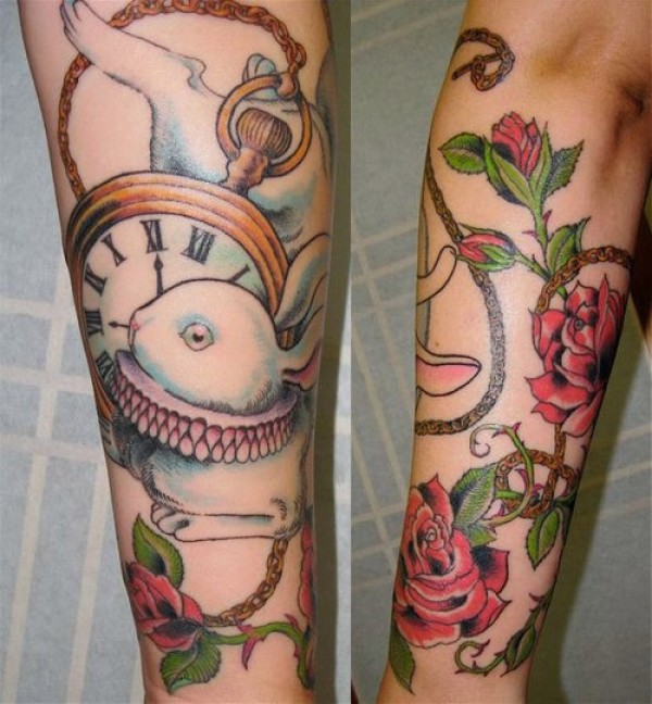 小臂彩绘兔子玫瑰和时钟纹身图案