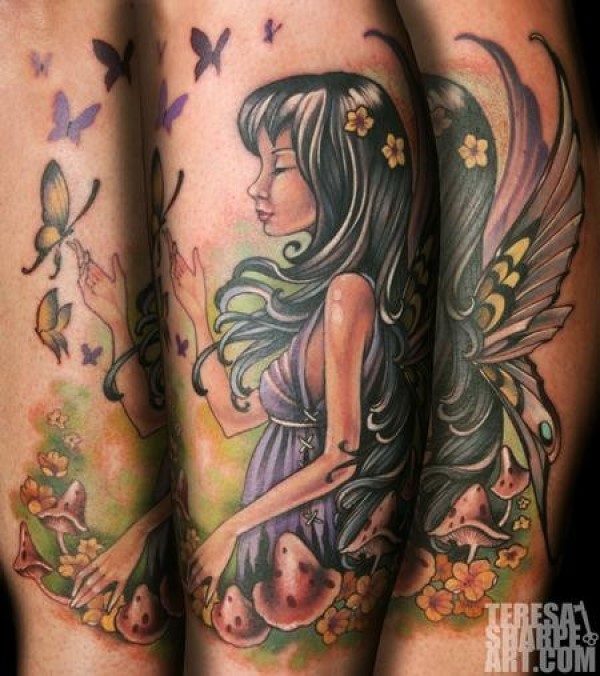 美丽的五彩梦幻女孩蝴蝶和蘑菇纹身图案