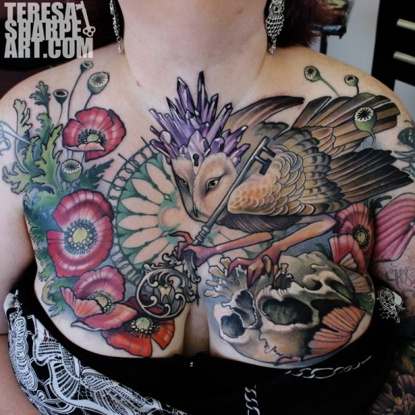 胸部彩色美丽的猫头鹰各种鲜花骷髅和钥匙纹身图案