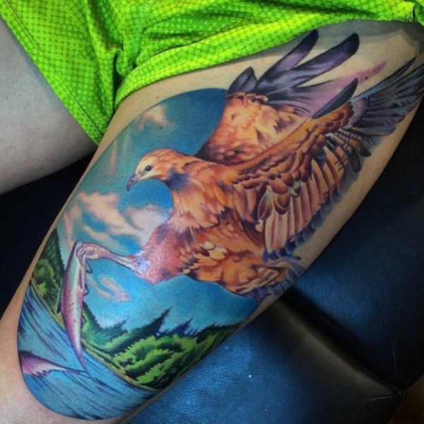 大腿美丽的彩色鹰与鱼纹身图案