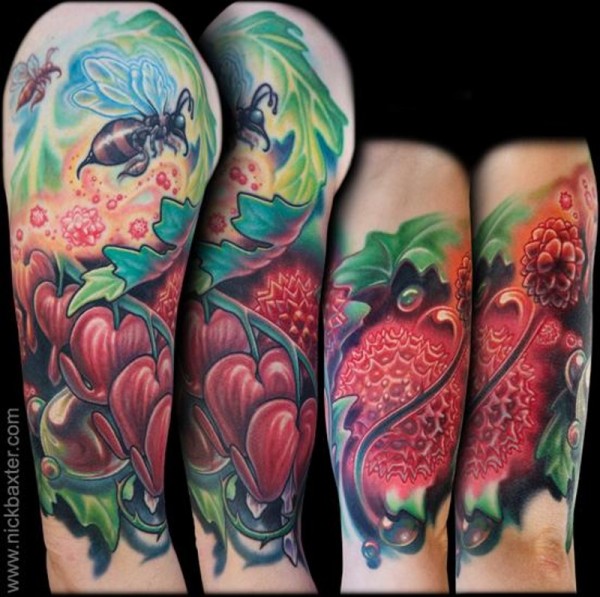 大臂非常美丽的彩色各种浆果和蜜蜂纹身图案