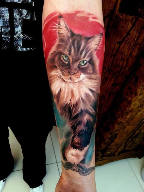 小臂华丽写实的猫肖像纹身图案