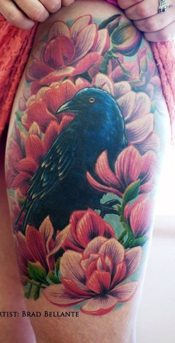 大腿美丽的彩绘乌鸦结合粉红色花朵纹身图案