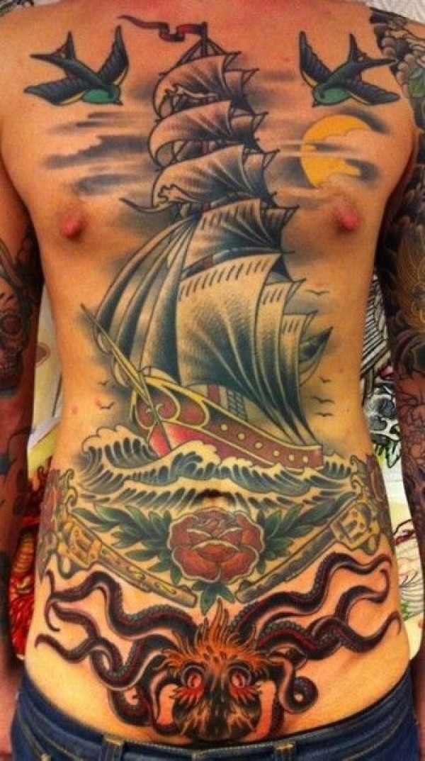 全身彩色的大帆船与鸟类和花卉纹身图案