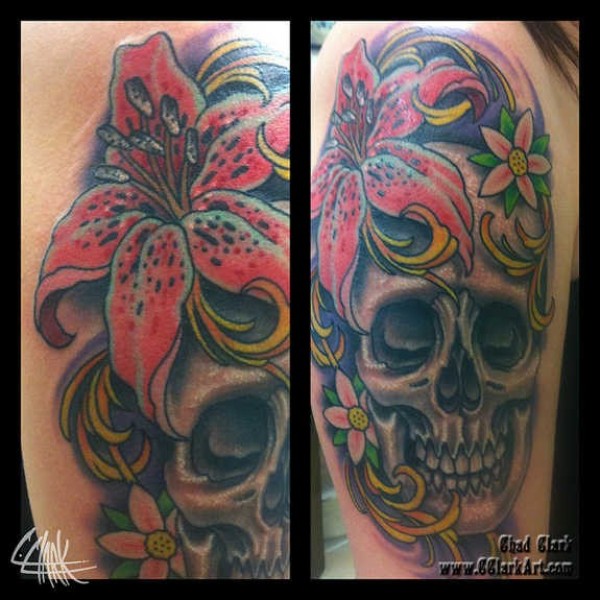 大臂old school彩色骷髅结合美丽的花朵纹身图案