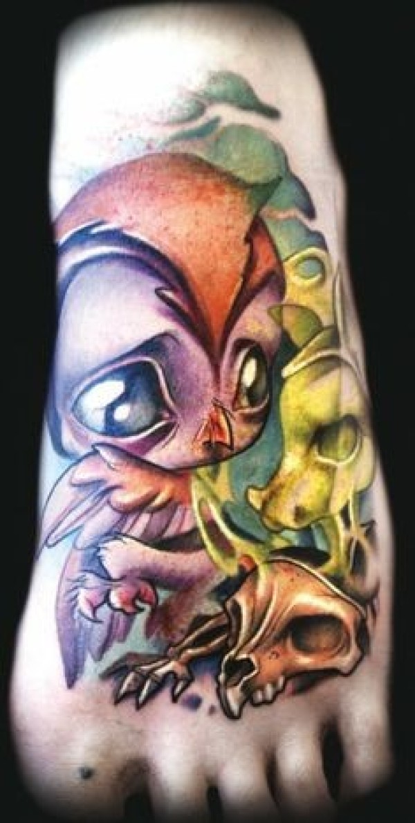 脚背漂亮的彩色小鸟与骷髅纹身图案