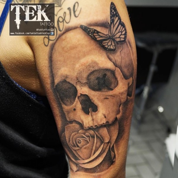 大臂美丽的黑白蝴蝶玫瑰和骷髅纹身图案