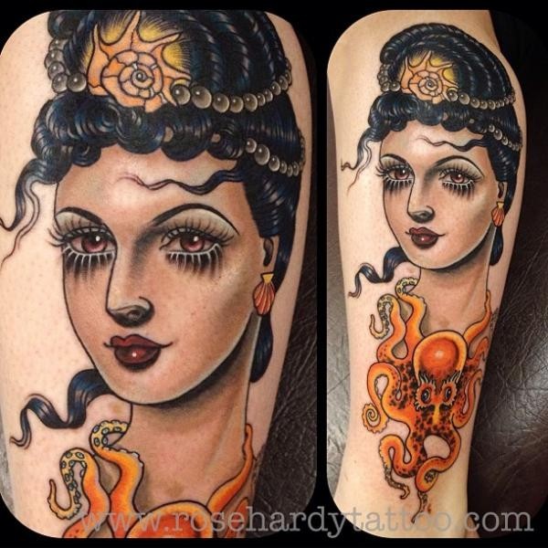 小腿old school美女肖像与章鱼纹身图案