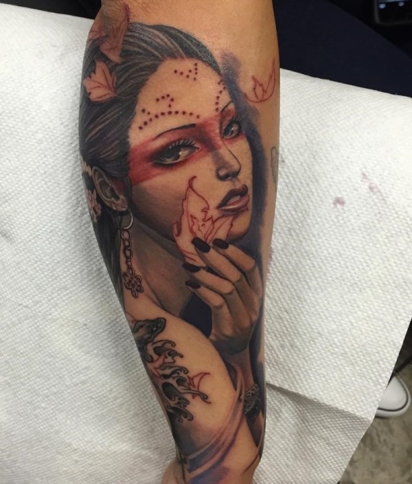 old school小腿彩色吉普赛妇女肖像纹身图案