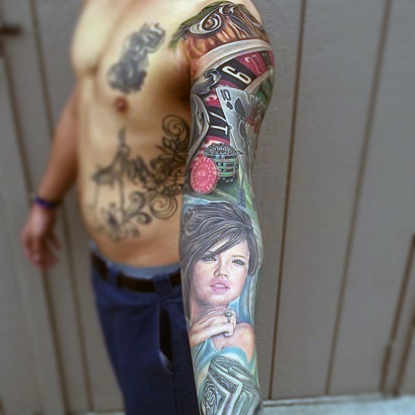 手臂漂亮的女士和赌桌彩色纹身图案