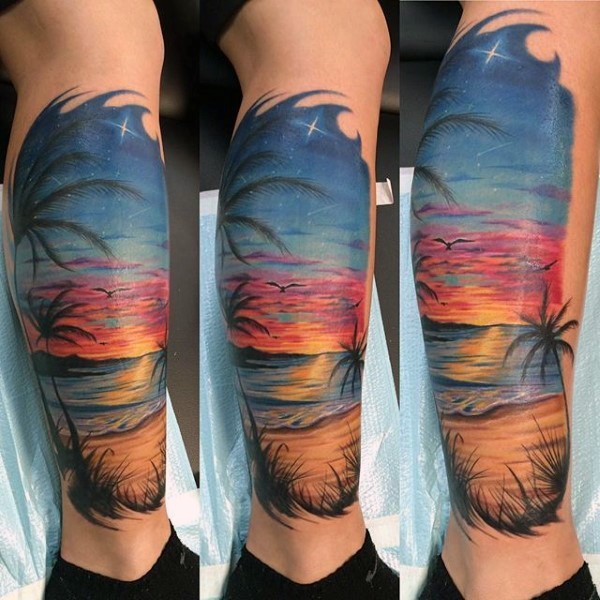 小腿美丽的彩绘海滩与棕榈树纹身图案