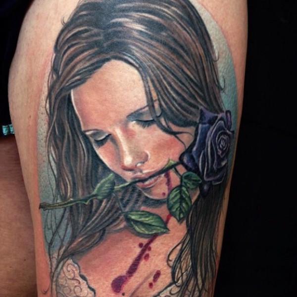 大腿戏剧风格彩绘女人与紫罗兰玫瑰纹身图案