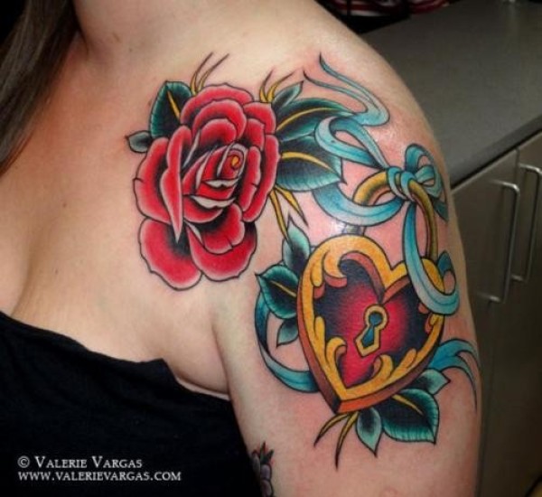 肩部美丽的彩色心形锁与玫瑰纹身图案