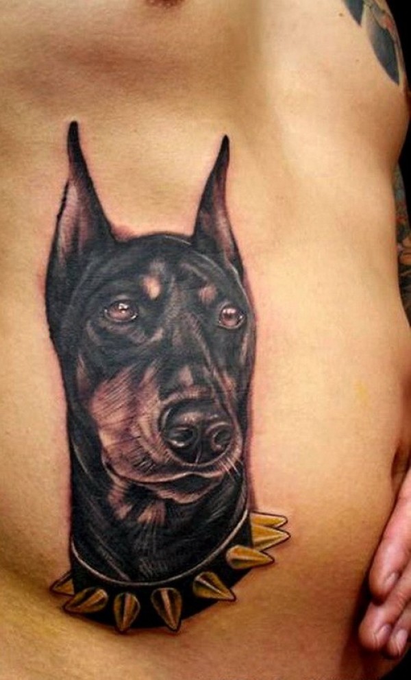 侧肋黑白的杜宾犬与狗项圈纹身图案