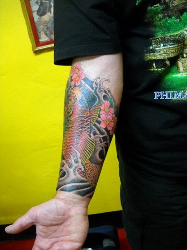 手臂美丽的日本鲤鱼和浪花纹身图案