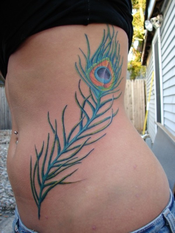 侧肋蓝色好看的孔雀羽毛纹身图案