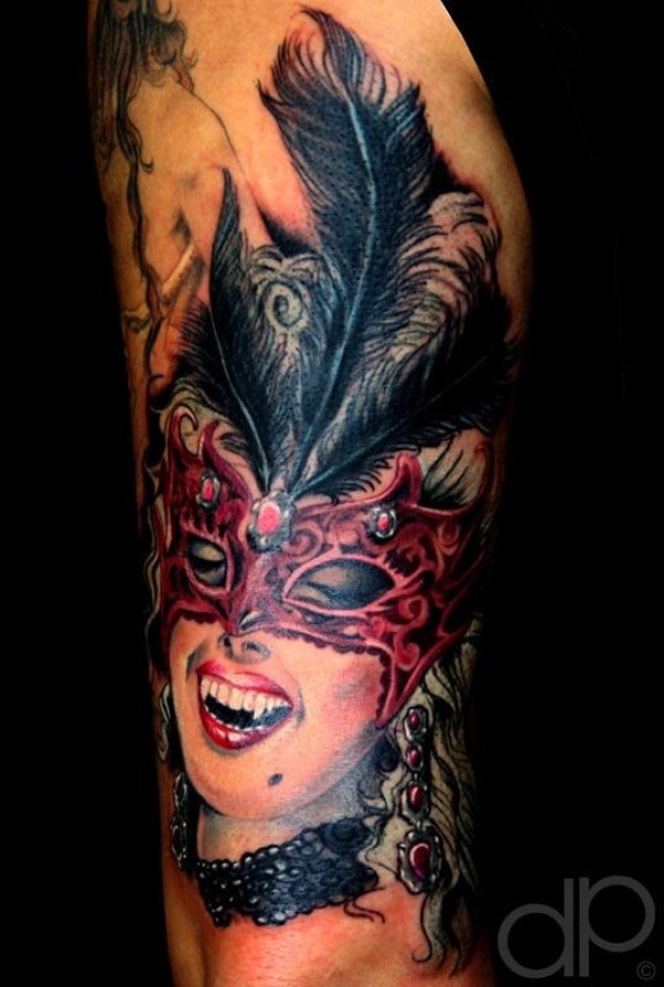 大臂多彩美丽的女吸血鬼羽毛纹身图案