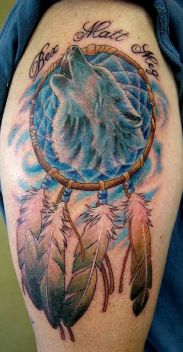 大臂彩色狼头与捕梦网纹身图案