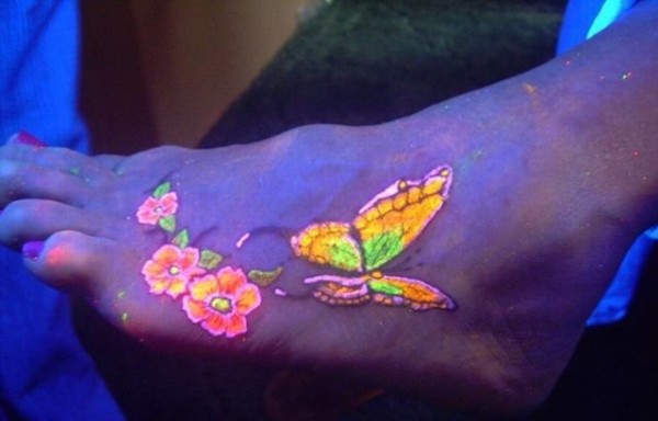 脚背彩色的荧光蝴蝶纹身图案