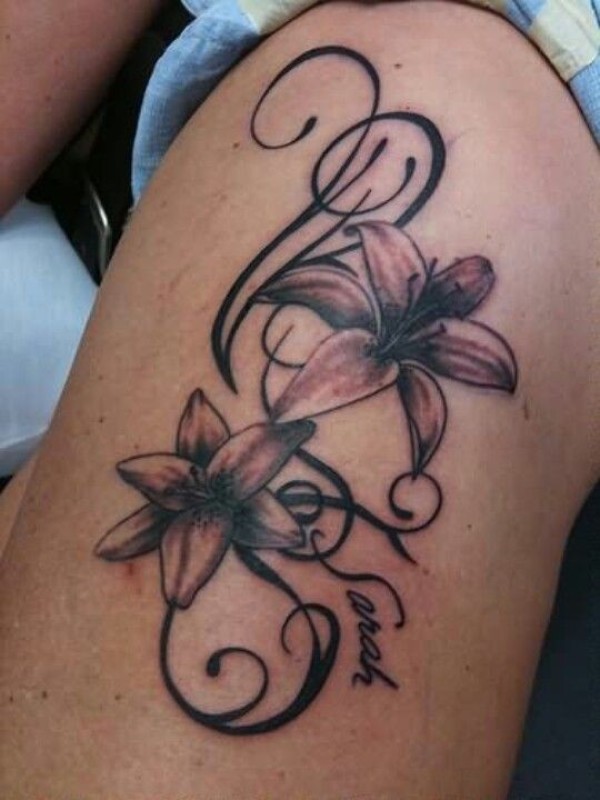 美丽的黑白夏威夷花大腿纹身图案