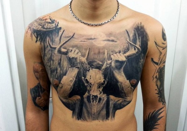 胸部黑色神秘小男孩与鹿头骨纹身图案