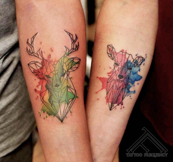 情侣小臂素描风格几何鹿头泼墨彩绘纹身图案