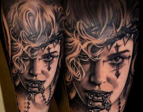 写实风格黑色十字架珠宝与毛骨悚然女人纹身图案