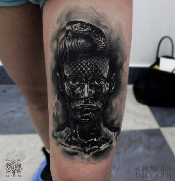 大腿令人印象深刻的黑色女人与蛇结合纹身图案