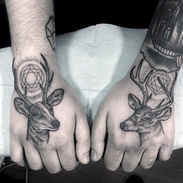 手背点刺风格黑色神秘的鹿和几何纹身图案