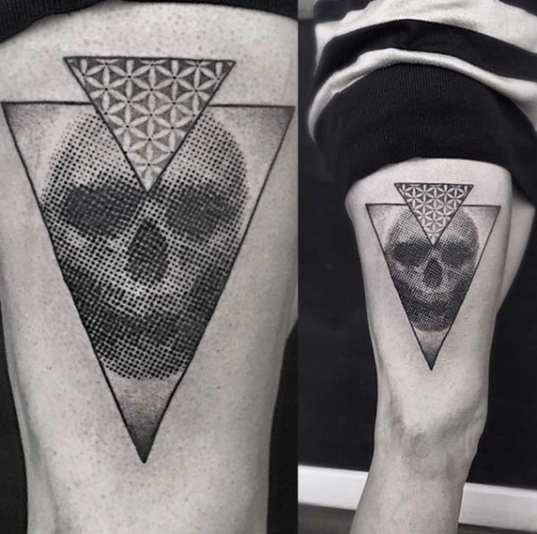 大腿壮观的黑色骷髅三角形纹身图案
