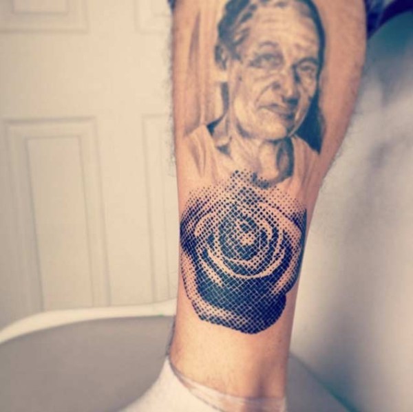 小腿old school黑色像素风格玫瑰和妇人肖像纹身图案
