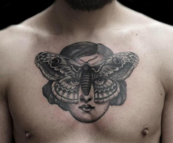 胸部雕刻风格黑色女性脸与蝴蝶面具纹身图案