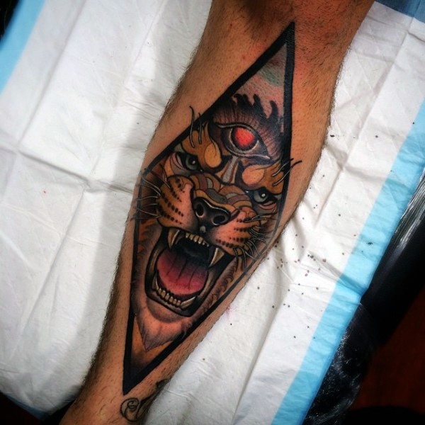 小腿new school黑色恶魔狮子与黑三角纹身图案