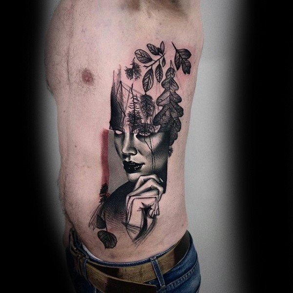 超现实主义风格侧肋黑色女性肖像植物纹身图案