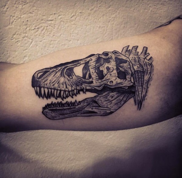 大臂雕刻风格黑色恐龙骨骼纹身图案