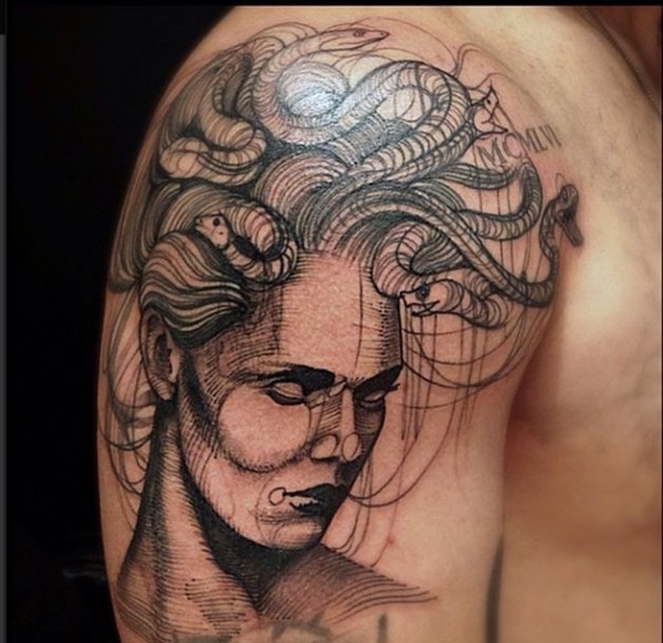 大臂雕刻风格黑色的美杜莎头像纹身图案