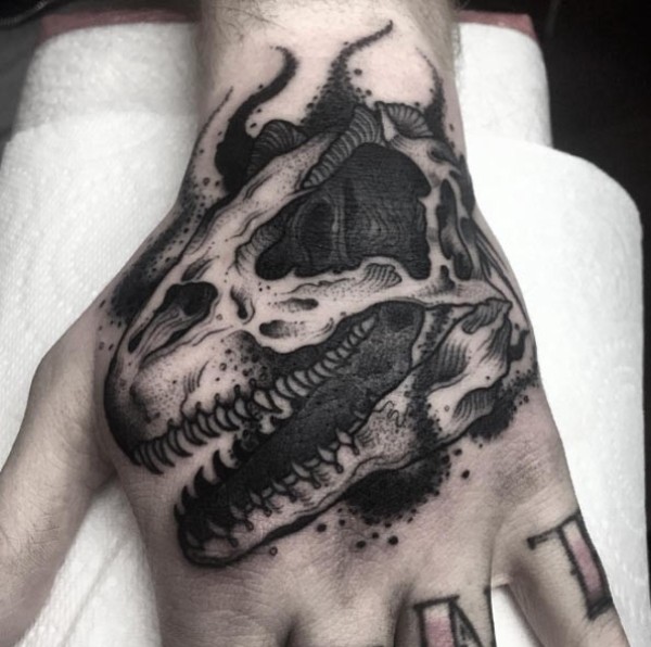 手背雕刻风格黑色恐龙头骨纹身图案