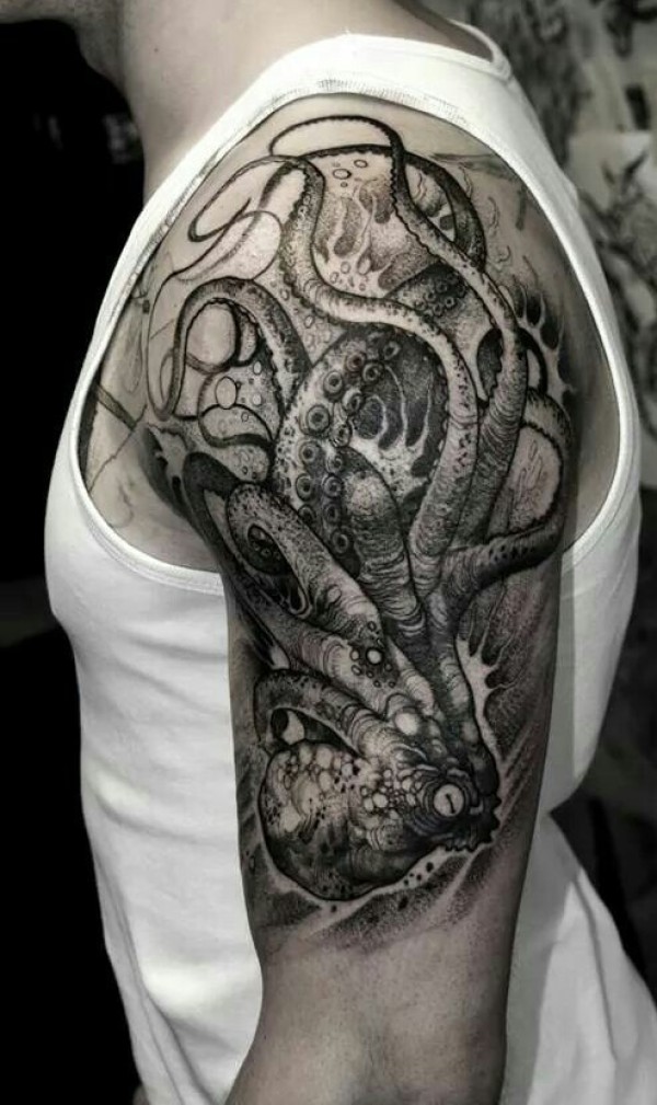大臂雕刻风格黑色恐怖章鱼纹身图案