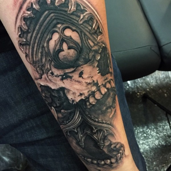手臂可怕的黑色骷髅与建筑物纹身图案